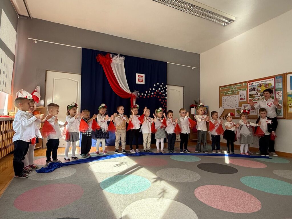 W naszym przedszkolu odbył się wyjątkowy poranek patriotyczny, podczas którego dzieci z grupy „Świetliki” zaprezentowały piękny występ dla całej społeczności przedszkolnej. Mali artyści z dumą recytowali wiersze, śpiewali piosenki o Polsce oraz tańczyli z wielkim zaangażowaniem i radością.