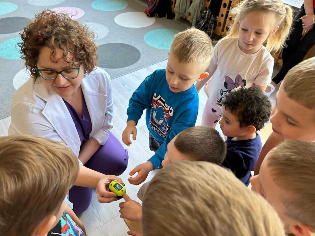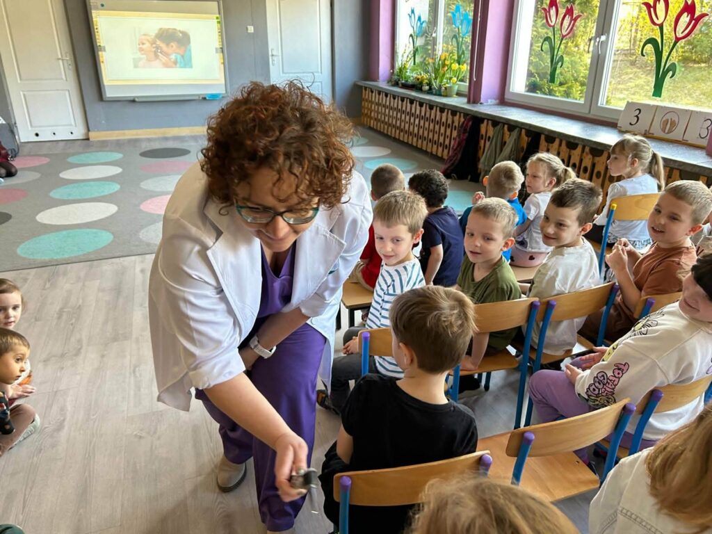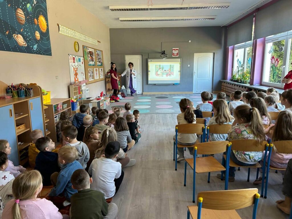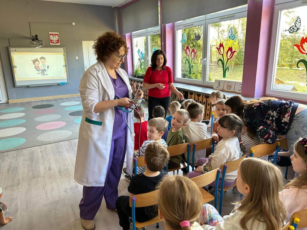 W dniu 07.04.2026 nasze przedszkolaki przyjęły wyjątkowych gości. Były to lekarka oraz położna pracujące w Ośrodku Zdrowia w Kluczach. Dzisiejsze spotkanie było doskonałą okazją, by pokazać maluchom, że biały fartuch wcale nie musi kojarzyć się ze stresem. Dzięki otwartości i ciepłemu podejściu naszych gości, dzieci mogły poczuć się jak mali odkrywcy tajemnic ludzkiego ciała. Takie spotkania uczą dzieci, że lekarz i położna to przyjaciele, którzy dbają o nasze bezpieczeństwo i dobre samopoczucie. Maluchy z wielkim zaangażowaniem zadawały pytania, a ich naturalna ciekawość została zaspokojona w atmosferze pełnej uśmiechu. Serdecznie dziękujemy naszym gościom za poświęcony czas oraz przekazanie cennej wiedzy przedszkolakom.