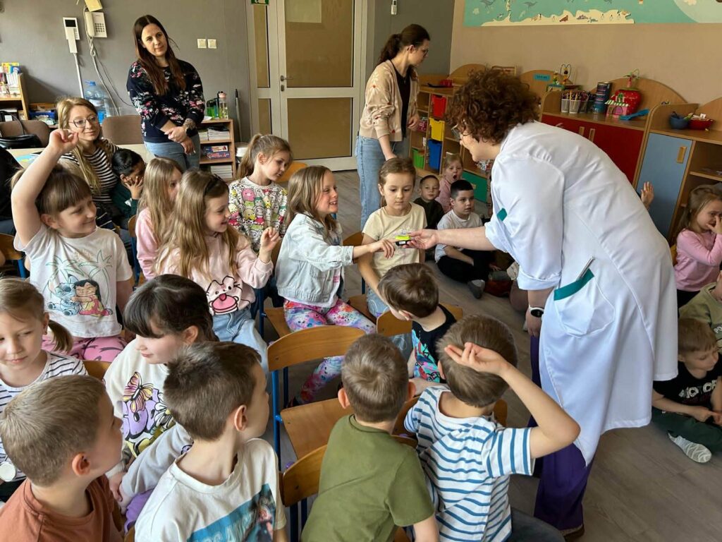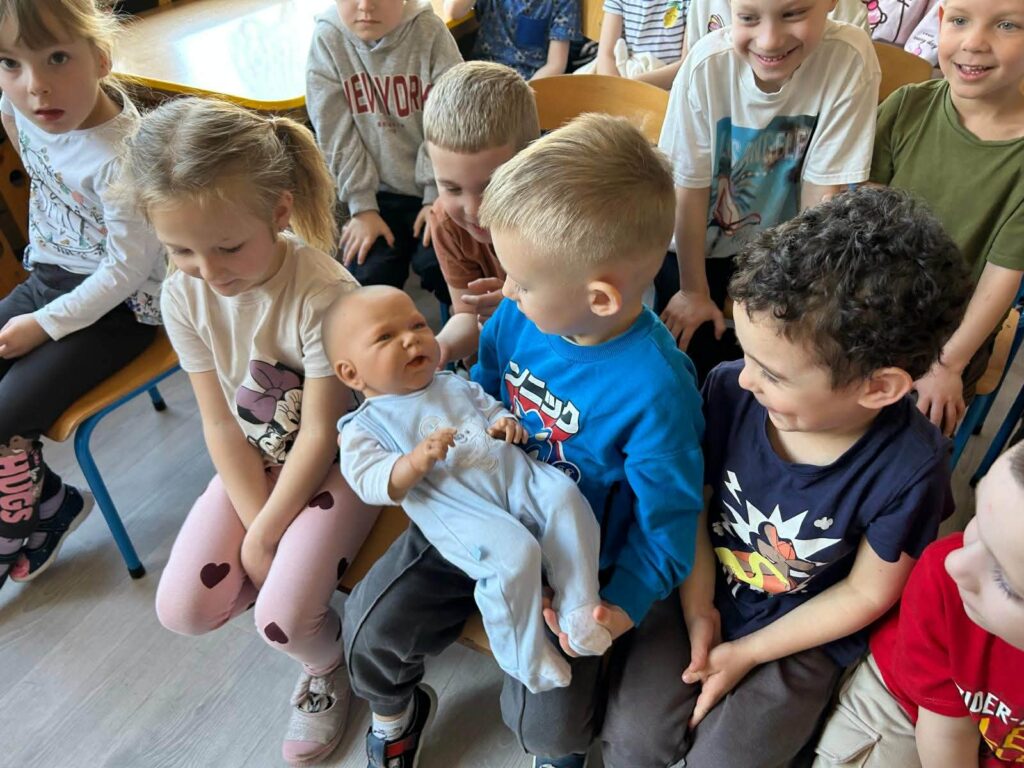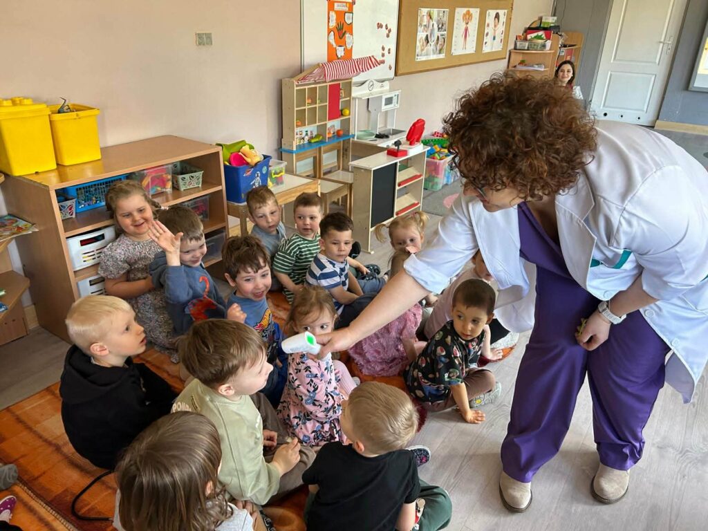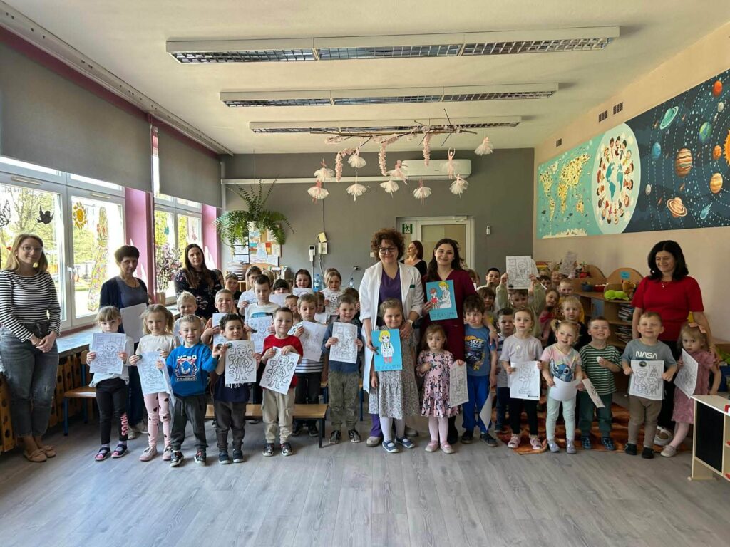 W dniu 07.04.2026 nasze przedszkolaki przyjęły wyjątkowych gości. Były to lekarka oraz położna pracujące w Ośrodku Zdrowia w Kluczach. Dzisiejsze spotkanie było doskonałą okazją, by pokazać maluchom, że biały fartuch wcale nie musi kojarzyć się ze stresem. Dzięki otwartości i ciepłemu podejściu naszych gości, dzieci mogły poczuć się jak mali odkrywcy tajemnic ludzkiego ciała. Takie spotkania uczą dzieci, że lekarz i położna to przyjaciele, którzy dbają o nasze bezpieczeństwo i dobre samopoczucie. Maluchy z wielkim zaangażowaniem zadawały pytania, a ich naturalna ciekawość została zaspokojona w atmosferze pełnej uśmiechu. Serdecznie dziękujemy naszym gościom za poświęcony czas oraz przekazanie cennej wiedzy przedszkolakom.
