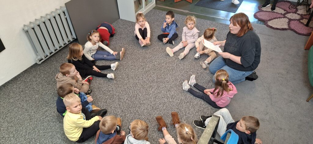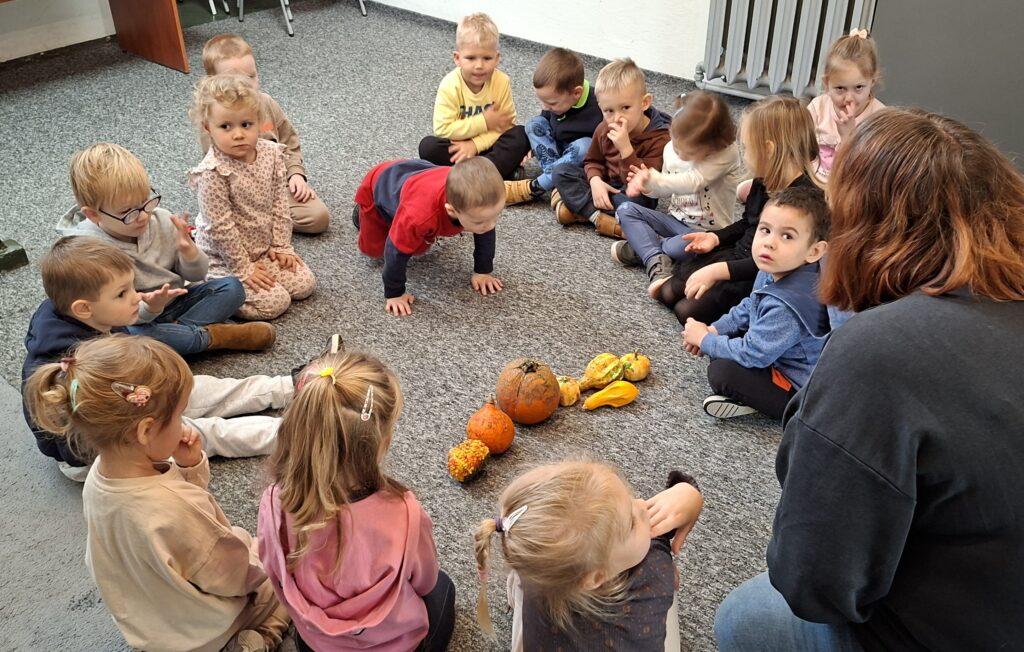 Z okazji Dnia Dyni dzieci z grupy „Świetliki” odwiedziły Bibliotekę Publiczną, gdzie wzięły udział w wyjątkowych zajęciach tematycznych. Było dyniowo, kreatywnie i bardzo radośnie! Mali uczestnicy poznali ciekawostki o dyniach, brali udział w zabawach i warsztatach plastycznych. Dziękujemy bibliotece za ciepłe przyjęcie i wspólnie spędzony czas!